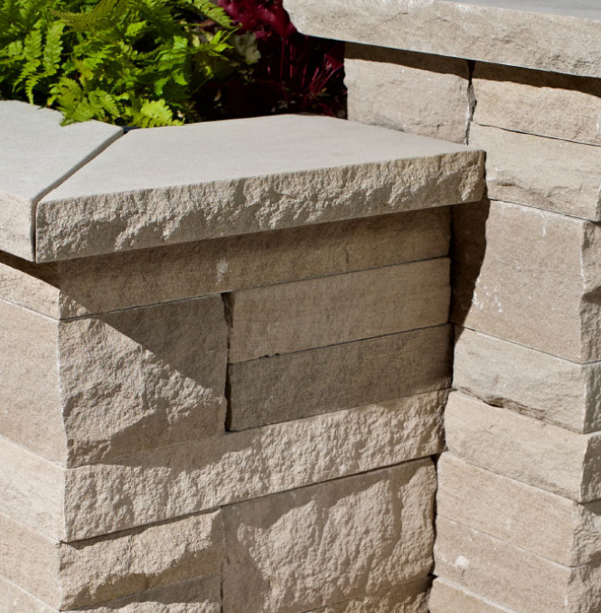 Buckskin wallstone is available as a 4″ thick X 8″ wide and 8″ X 8″ wallstone, 4″ X 4″ edging, and 6″ thick steps.