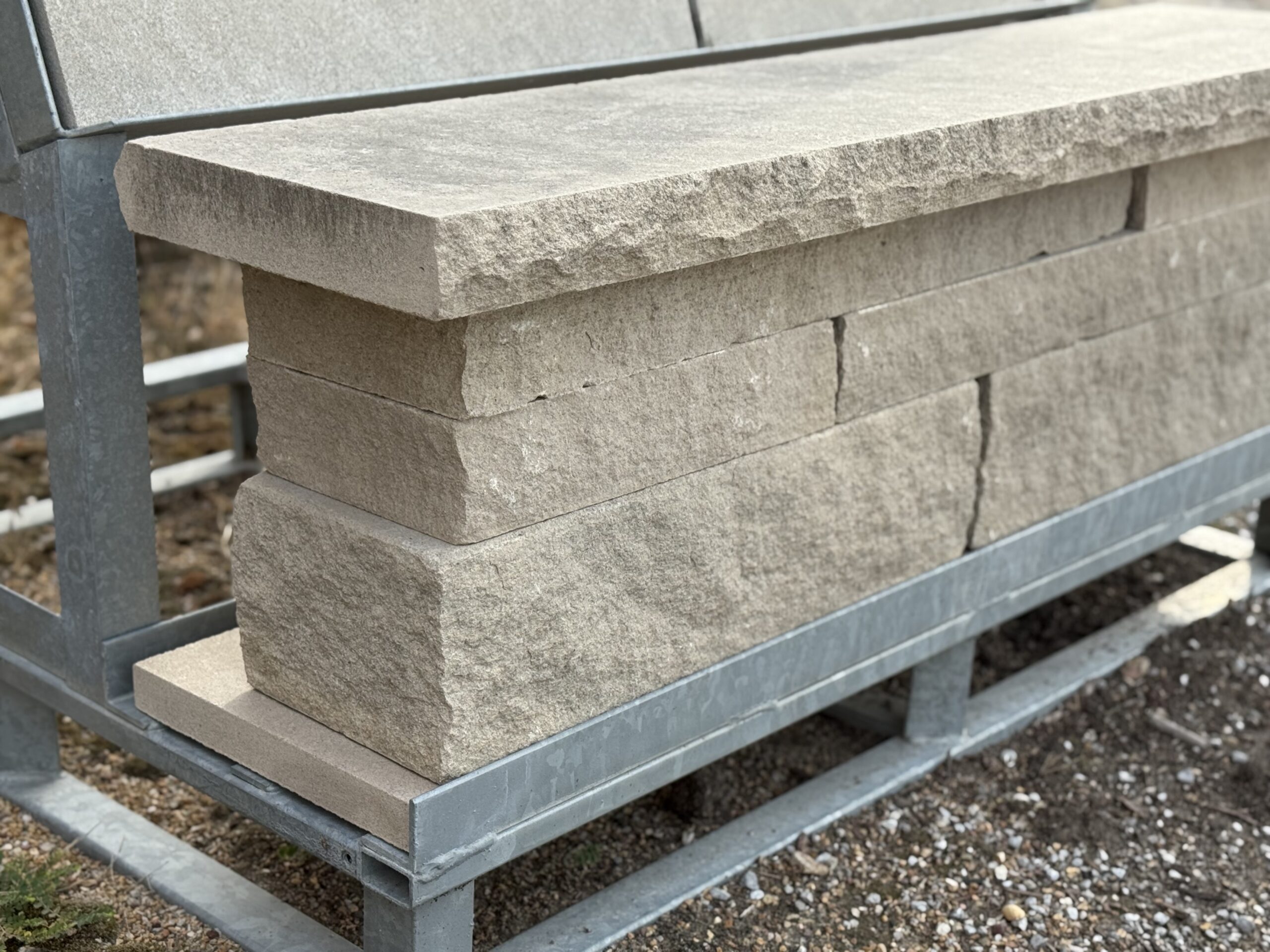 Desert Cream wallstone is available as a 3-4″ thick X 8″ wide and 4″ X 4″ edging. Steps and benches are available also.